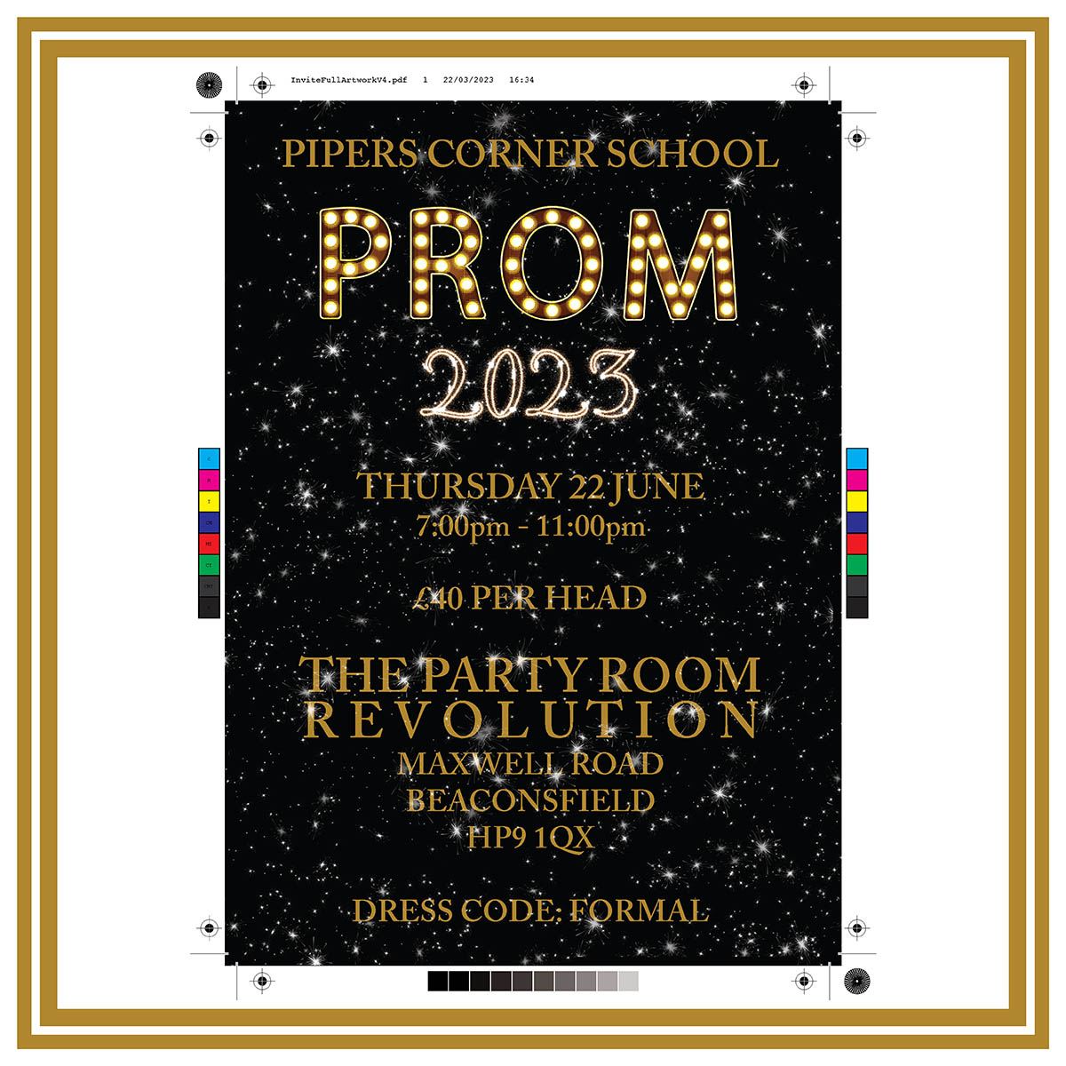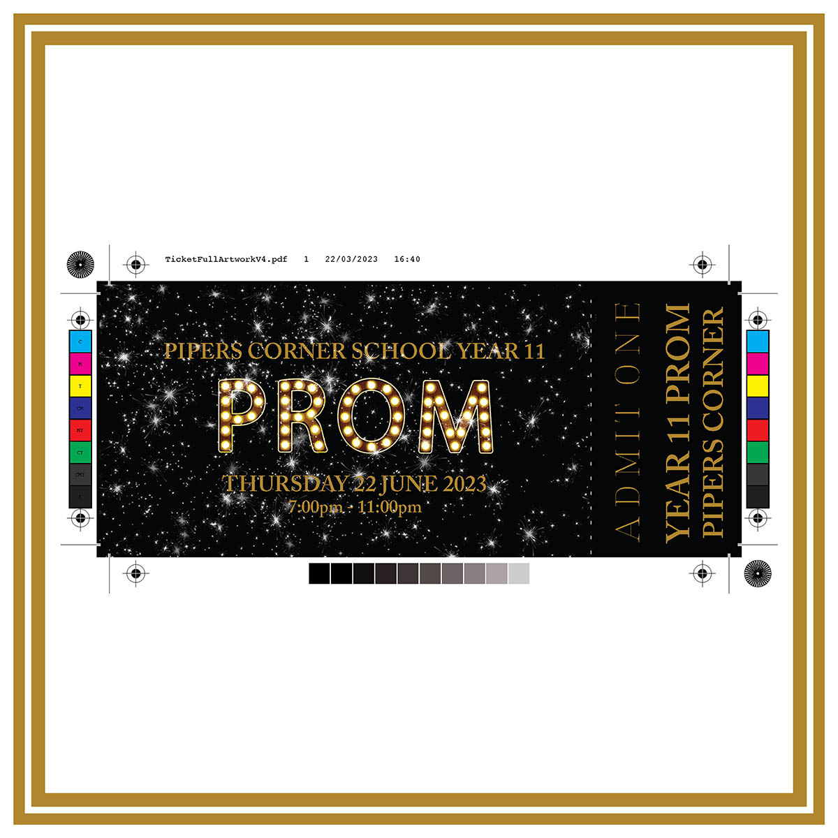 When designing an invite for the girls Yr11 prom, we wanted it fun, bold, elegant and not a “typical” Prom invite for 15/16 yr olds. Ingrid designed an invite and an admit one ticket that was exactly as we explained in the brief and we both really enjoyed the process of adding the metallic gold foil during the print process!